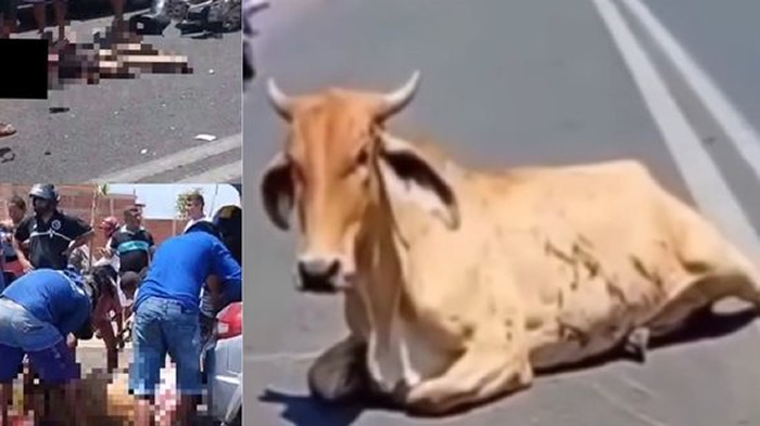 a vaca aparece viva, deitada no asfalto. Em