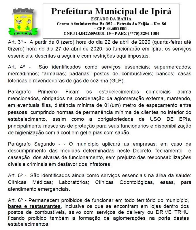 funcionarão em Ipirá, os SERVIÇOS ESSENCIAIS: