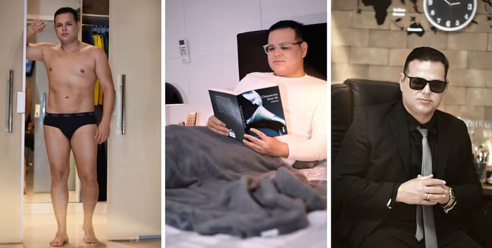 ora de terno, lendo o livro Cinquenta Tons de